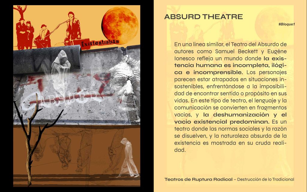 Teatro Dada: Tristan Tzara, Hugo Ball, Emmy Hennings; Teatro del Absurdo: Samuel Beckett, Eugène Ionesco, Jean Genet; Teatro de la Crueldad: Antonin Artaud, Peter Brook (influenciado)