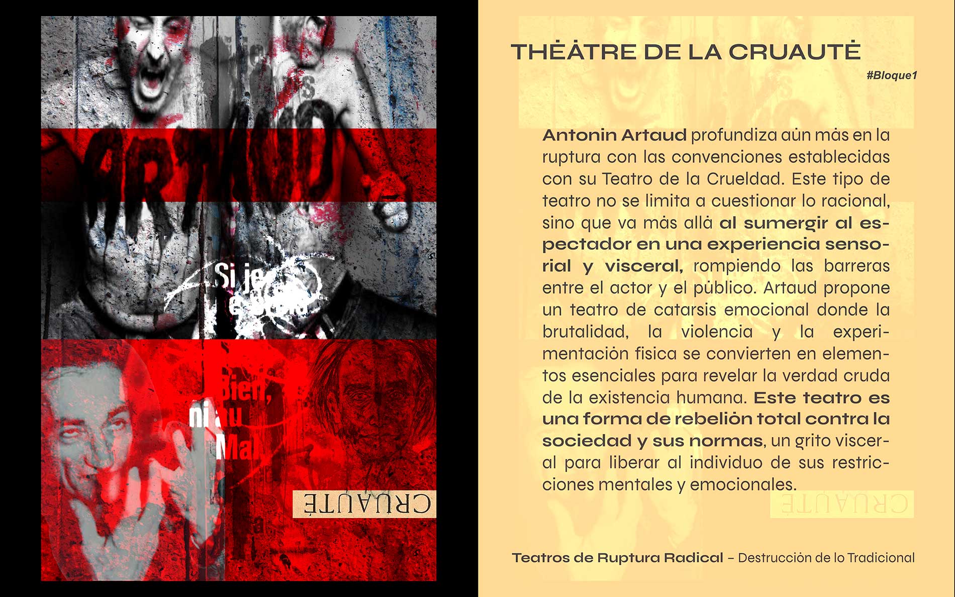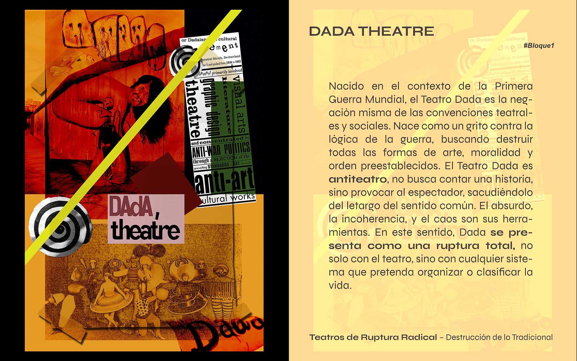 Una serie de carteles digitales que rinden homenaje a los movimientos que transformaron el teatro en el siglo XX. Ruptura, acción política, experimentación y palabra radical: cuatro bloques que exploran desde el caos dadaísta hasta la fuerza del cuerpo en escena.