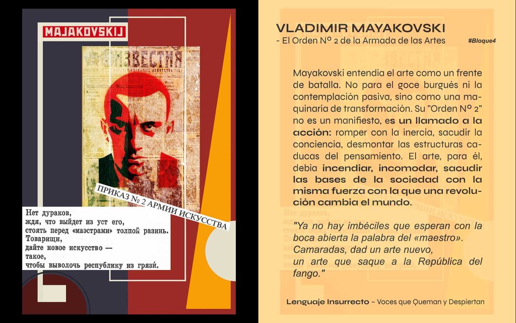 Las voces de Artaud y Mayakovsky siguen resonando como un recordatorio de que el arte debe ser un acto de resistencia, una fuerza disruptiva capaz de transformar no solo lo que vemos, sino lo que somos. Nos muestran que el arte no es un refugio, sino un campo de batalla donde se juega la posibilidad de un cambio profundo.